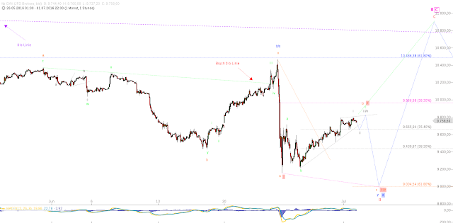 Vermutlich befindet sich die orangene b nach der hellgrünen a=9718 und hellgrünen b=9213 in der hellgrünen c, die als EDT (graue Eindämmungslinien) interpretiert werden kann. In dem EDT wäre erst die graue i bei 9805 markiert worden. Der Zielbereich der grauen ii liegt zwischen 9665 und 9439 (graue Fibos). Der Rücklauf seit 9805 hat weder die untere graue Eindämmungslinie noch das Mindestziel erreicht.