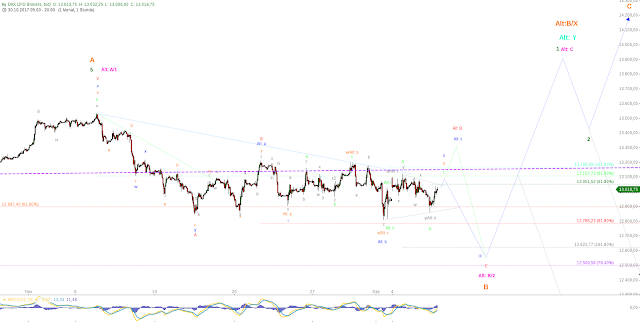Der korrektive Anstieg auf 13211 kann bereits die vollständige rote B sein. Es kann sich aber auch erst um die blaue Alt: a der roten B handeln, wobei die zu erwartenden Verlaufsformen der beiden Szenarien mittlerweile kaum zu unterscheiden sind.