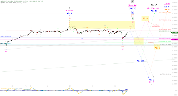 Die lila 5/lila Alt: B bildet – ausgehend von 8612 - ein Doppelzigzag mit blauer W=12931, blauer X=11324 sowie laufender blauer Y (bisher 15511; als Zigzag mit orangener A=13294, orangener B=13006, orangener C bisher 15511 im Zielbereich zwischen 14223 und 16193 – orangene Fibos). Mit Eintritt in den Zielbereich wurde im DAX die Marke „Sturmwarnung“ überschritten.